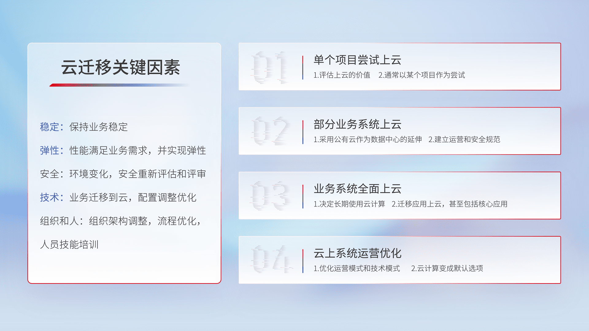 结合实际业务,,,从规划设计、、、云平台选型、、云原生改造、、数据迁移、、集成交付,,,,迁移全过程为客户识别最佳上云路径,,做好风险识别管理,,,,设计网络架构、、、身份权限、、、、安全审计合规、、、、操作审计、、、日志审计、、监控告警策略、、多站点容灾设计等,,,对云上基础设施进行整体规划,,,提升IT治理水平,,,以满足弹性、、、、高可用、、、、高性能的需求。。