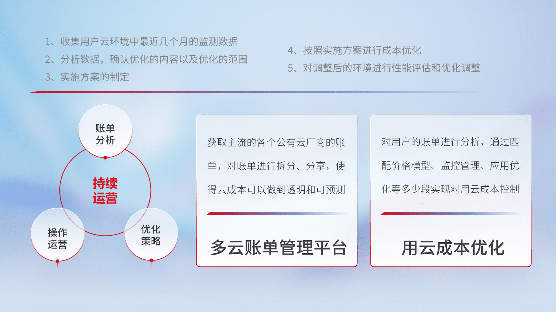通过多云纳管,,以统一的资源数据模型把客户的云资源进行抽象和封装,,,,进而实现对多云资源的统一操作,,保障云资源管理的可靠性、、稳定性与可用性。。。量身定制化运维内容,,,配置、、开发运维、、补丁管理、、、、备份、、监控、、、、认证和访问管理、、、、审计和日常巡检等,,保障在用云过程中的可靠度,,,,稳定度以及高可用率。。