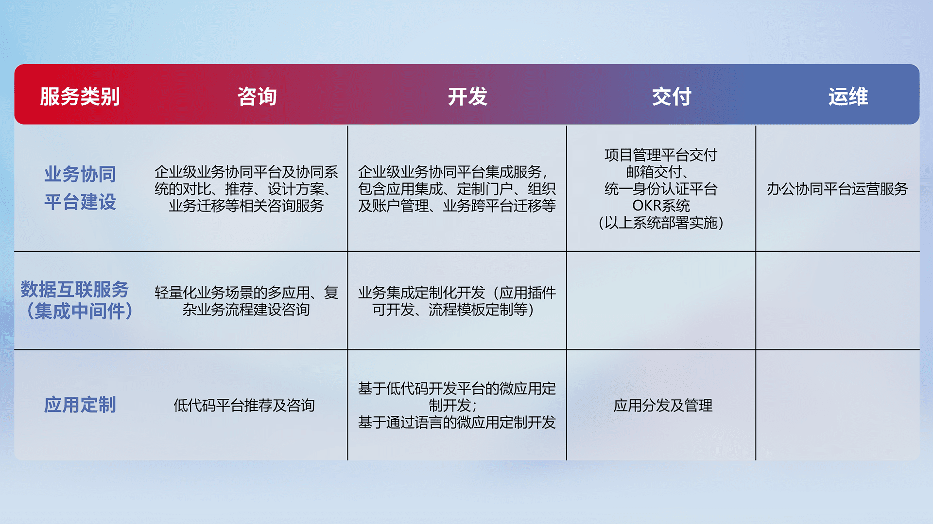 针对钉钉、、企微、、、、IDaas等平台级产品提供产品的规划、、、方案、、交付、、定制化开发等服务,,实现如统一协同办公、、、、智能客户服务、、、混合会议管理、、智能数据查询、、等业务场景,,实现数字化转型。。